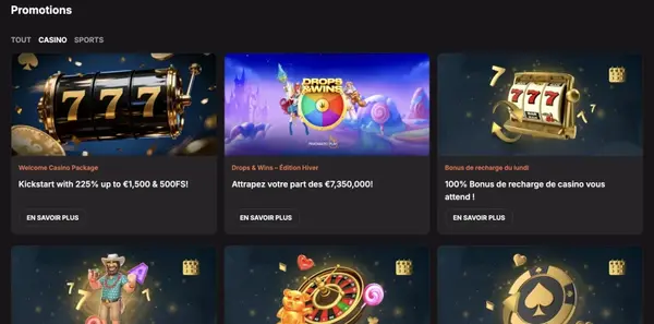 Nos promotions sont conçues autour de paliers de dépôt clairs, avec un dépôt minimum constant de €25 pour les principales offres de bienvenue casino. Vous pouvez suivre les offres actives dans votre profil afin de savoir ce qui est en bonus, ce qui est en solde réel, et quelles conditions de mise s’appliquent.
